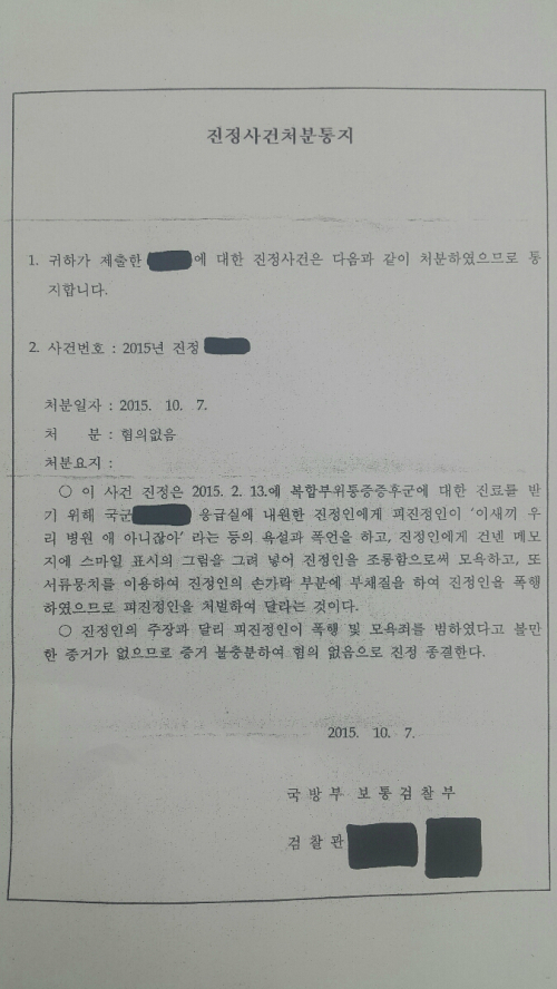 | 국방부 보통검찰부는 이씨의 진정에 대해 증거가 없다며 혐의 없음으로 사건을 종결했다. |