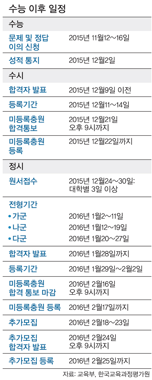 올해 수능 성적을 100% 반영하는 대학은 경희대와 동국대, 서울대, 서울시립대, 성균관대, 숙명여대, 중앙대, 한양대, 홍익대 등이다. 수능을 90% 반영하는 대학은 건국대와 고려대, 서강대, 서울시립대, 연세대, 이화여대, 한국외대 등이다.