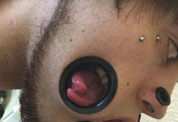 볼에 난 커다란 구멍은 그의 어금니 부분의 치아를 훤히 보여준다. 끝 부분이 살짝 갈라진 혓바닥이 양 볼에 난 구멍을 통해 들락날락 하는 장면은 그야말로 엽기적이다. 그는 피어싱 뿐 아니라 혀 끝 부분을 살짝 가르는 수술도 받았다.