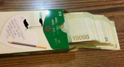 상자 일부를 뜯은 뒤 돈다발을 넣고 상자를 다시 감쪽같이 붙여 완성한 것이었다. 뒷면에는 짤막한 편지가 함께였다.