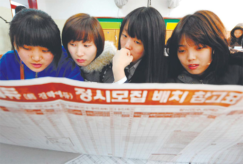| 지난 12일 실시된 대학수학능력시험 가채점 결과를 바탕으로 대학별 환산점수로 변환한 후 지원가능한 대학을 찾아 목록을 만들면 수능성적 발표 후 대학과 학과를 선택할 때 여유 있고 치밀하게 지원전략을 수립할 수 있다. 사진은 수능을 치른 학생들이 교실에서 정시모집 배치 참고표를 보고 있는 모습. 세계일보 자료사진 |