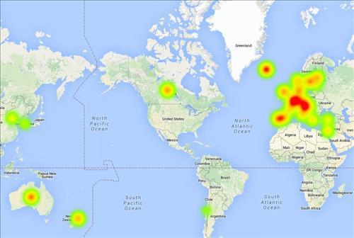 | OECD `한눈에 보는 보건의료 2015`에 따르면 한국의 항우울제 소비량은 세계에서 두 번째로 낮았다. 그림에서 색상이 붉을수록 항우울제 소비량이 많고 초록색에 가까울 수록 소비량이 낮은 국가임. |