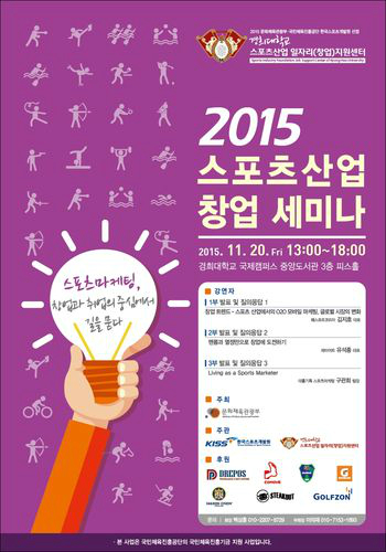 '스포츠마케팅, 창업과 취업의 중심에서 길을 묻다'란 주제로 열리는 이번 세미나는 문화체육관광부가 주최하며 경희대학교 스포츠마케팅 학술 동아리 '드레포스' 학생들이 직접 주관, 창업자 자질 및 적성 체크, 연사 강연, 마지막으로 창업박람회 및 퀴즈쇼 순서로 진행된다.