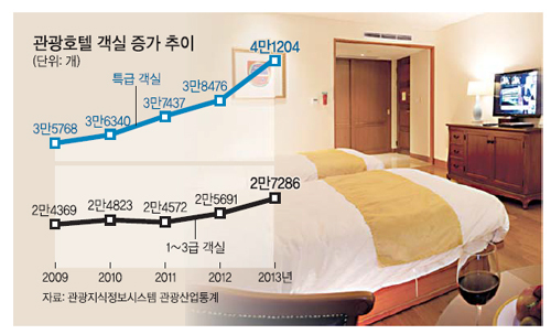 중저가 숙박시설의 수급 불균형은 비단 서울만의 문제는 아니다. 관광지식정보시스템 관광산업통계에 따르면 2013년 현재 특급 관광호텔의 객실은 4만1204개로 1∼3급(2만7286개)보다 1만개 넘게 많았다. 2009∼13년 연평균 객실 증가율로 비교해도 1∼3등급은 2.9%에 불과해 3.6%인 특급에 못 미쳤다. 이에 비해 등급을 받지 않아 열악할 것으로 우려되는 ‘등급미정’ 관광호텔의 객실 수는 연평균 11.6%나 늘어났다.