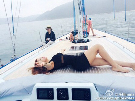 공개된 사진에서 미나는 요트 위에 누워서 포즈를 취하고 있다.