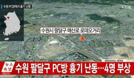이날 오후 5시 20분께 수원역 앞의 한 PC방에서 이모씨는 자신의 뒷자리에 있던 손님 A(24)씨와 친구 3명 등 4명에게 흉기를 휘둘렀다.