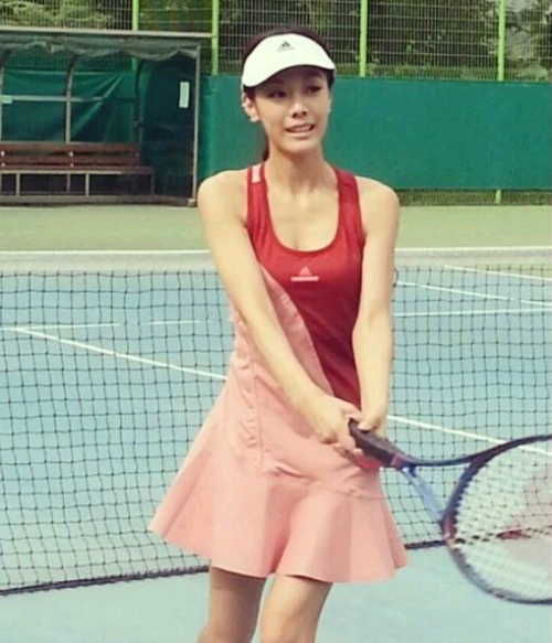 공개된 사진 속 손수경은 핑크색 테니스 유니폼을 착용하고 모자까지 매칭해 여느 테니스 선수보다 멋진 패션감각을 선보였다.