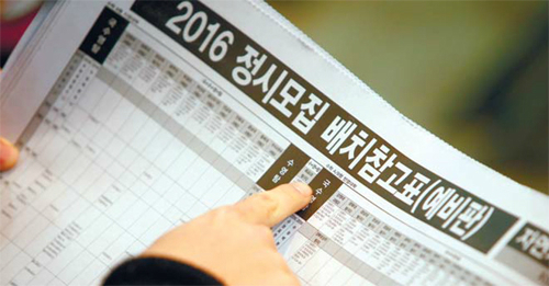 | 다음달 24일부터 원서접수가 시작되는 2016학년도 대입 정시모집에서 좋은 결과를 얻기 위해서는 경쟁자들의 지원패턴을 분석하고 성적별, 가·나·다군별 지원성향을 통해 자신에게 유리한 지원전략을 세우는 것이 중요하다. 사진은 최근 서울에서 열린 한 입시설명회에서 학부모가 정시모집 배치참고표를 보고 있는 모습. 연합뉴스 |