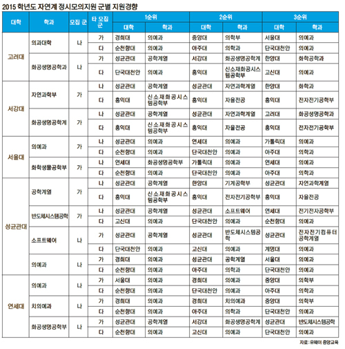 의예과를 제외한 서울대 지원자들은 나군에서 고려대, 연세대, 성균관대 자연계 상위권 학과(의예, 공학계열 등)에 지원하고 다군의 의예과에 지원한다. 동국대(경주) 의학학석사통합과정은 특정 모집군을 정하고 있지 않아 가/나/다군에서 타 대학에 지원 후 추가로 지원할 수 있다. 올해는 중앙대(서울)가 다군에 자연계열 선발을 추가하여 창의ICT공과대학 등 일부 학과를 선발할 예정이어서 최상위권 수험생의 지원이 몰릴 것으로 보인다.