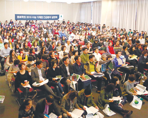 | 지난 15일 부산 해운대구 벡스코에서 한 입시학원이 마련한 `2016 수능 가채점 긴급분석 설명회`에서 많은 학부모들이 강사의 설명을 듣고 있다. 수능 점수가 공식 발표되기 전에도 가채점 점수를 토대로 원점수, 표준점수를 예측하고 지원가능 대학의 구체적인 반영비율을 미리 정리해두면 입시전략을 짜는 데 도움이 된다. 세계일보 자료사진 |