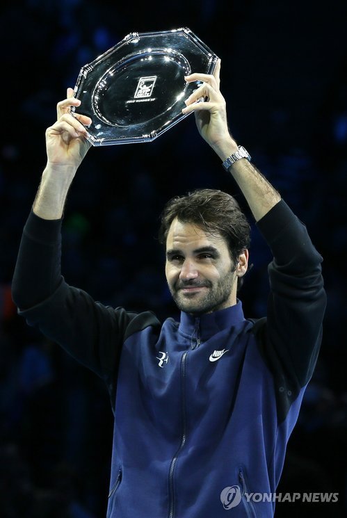 | 영국 런던에서 열린 `바클레이스 월드 투어 파이널스`(총상금 700만 달러) 단식 경기 종료 후 2등을 차지한 페더러가 상패를 들어 보이고 있는 모습 <<AP=연합뉴스>> |