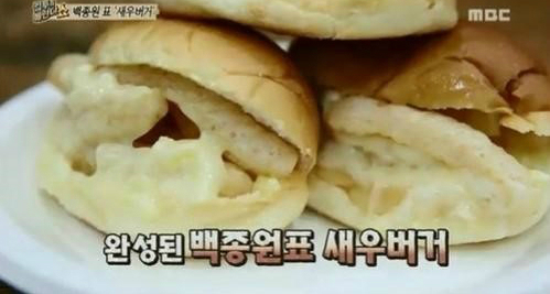 당시 공개된 백종원의 레시피는 단무지를 다진 것에 설탕, 마요네즈를 넣고 비벼 만든 타르타르소스를 빵 사이에 바른 후, 새우 과자를 듬뿍 넣으면 완성된다.