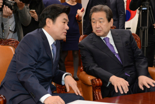 | 3일 오전 서울 여의도 국회에서 정의화 국회의장이 의장실에서 선거구 획정안을 위한 여야 대표 회동을 연 가운데 새누리당 김무성 대표와 원유철 원내대표가 대화를 하고 있다. 남정탁 기자 |