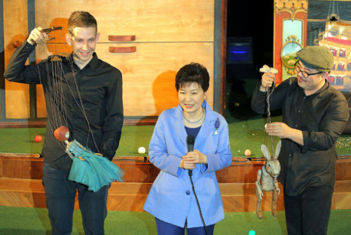 | 체코를 방문 중인 박근혜 대통령이 2일 오후(현지시간) 프라하 국립인형극장을 방문해 한·체코 협력 인형극 ‘다락에서’를 관람한 뒤 무대에 올라 인사말을 하고 있다. 오른쪽은 인형 작가 문수호씨, 왼쪽은 체코 작곡가 얀 클라스씨. 프라하=연합뉴스 |
