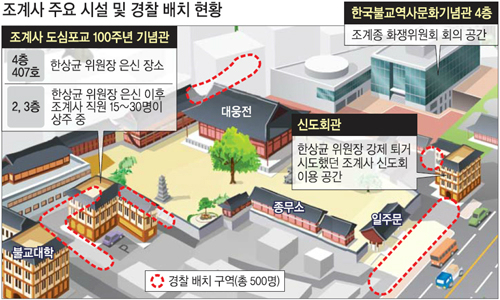 이들 신도는 그러나 한 위원장이 머물고 있는 이 건물 4층 입구의 철문이 굳게 잠겨 진입하지 못했다. 일부는 철문을 열려고 조계사 인근 열쇠집을 찾기도 했다. 신도들은 3시간여 가량 한 위원장의 강제퇴거를 시도하다가 결국 빈손으로 물러났다. 기념관에 대기 중이던 조계사 관계자가 “내일까지 한 위원장이 나가지 않으면 열쇠를 주겠다”며 신도들을 설득했다는 후문이다.