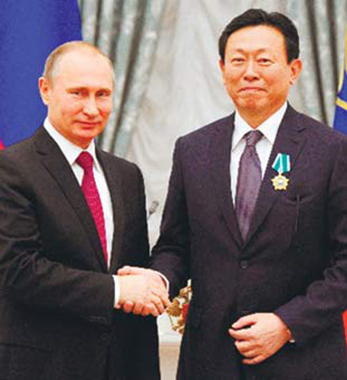 | 롯데그룹 신동빈 회장(오른쪽)이 10일(현지시간) 러시아 모스크바 크레믈궁에서 블라디미르 푸틴 러시아 대통령으로부터 우호훈장을 받은 후 악수하고 있다. 크레믈궁 제공 |
