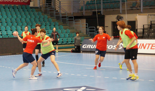 | 연습 구슬땀 여자핸드볼 국가대표팀이 12일 덴마크 콜딩 핸드볼 경기장에서 러시아와의 16강전을 앞두고 맹훈련을 하고 있다. 남정훈 기자 |