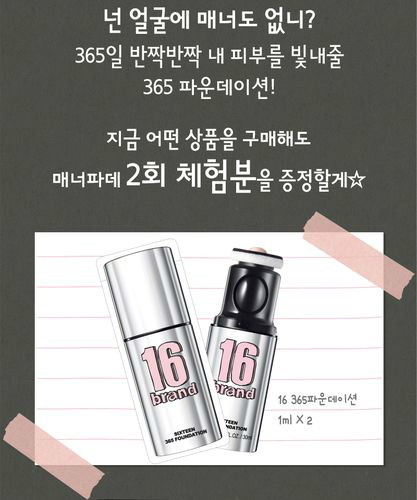 오는 31일까지 진행되는 이번 이벤트는 16브랜드 온라인 스토어에서 제품을 구매한 고객들을 대상으로 진행되며, 구매 고객 모두에게 16 365 파운데이션 샘플 체험분을 선물로 증정한다.