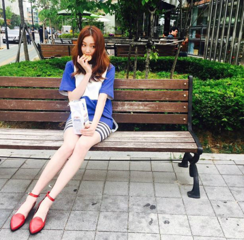 공개된 사진 속 이성경은 벤치에 앉아 쿠키를 먹고 있다. 이성경의 길고 날씬한 각선미가 눈길을 끌었다.