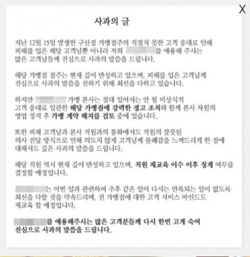 이후 해당 업체에 대한 네티즌들의 항의가 빗발쳤고 논란이 계속 되자 자맹점주 B씨가 "저의 잘못된 처신이 이번 사건의 결정적인 잘못"이라고 사과를 전했다.
