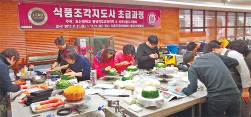 | 호산대 학생들이 식품조각지도사 과정 수업에서 수박, 호박, 당근 등의 식재료에 조각을 새겨넣고 있다. 호산대 제공 |
