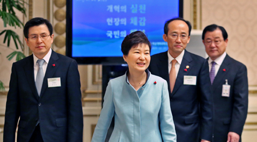 | 박근혜 대통령이 23일 청와대 영빈관에서 ‘2015년 핵심개혁과제 성과점검회의‘를 주재하기 위해 황교안 국무총리(왼쪽) 등과 입장하고 있다. 왼쪽 세번째, 네번째는 추경호 국무조정실장, 청와대 이병기 비서실장. 청와대사진기자단 |