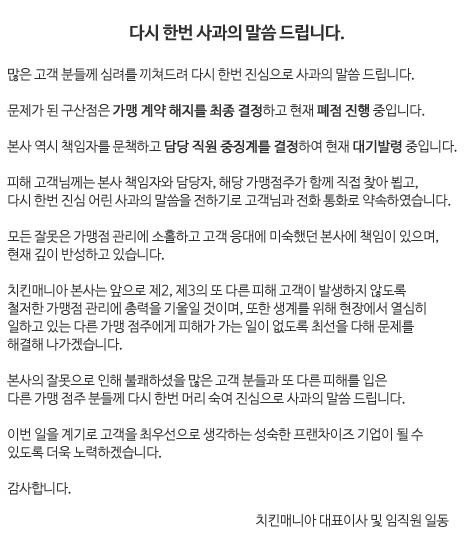 또한 "모든 잘못은 가맹점 관리에 소홀하고 고객 응대에 미숙했던 본사에 책임이 있으며 깊이 반성 중"이라고 사과를 거듭 이어갔다.
