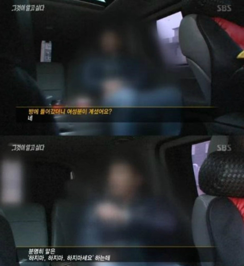 그는 이어 여자가 눈 가리고 묶여 있더라 . 손을 묶어 놨더라 . 저항을 좀 했다 . ‘하지마 . 하지마 . 하지마세요 반항하는데 몸을 쓰지 못하는 거다 . 이 사람은 의식은 하지마세요 . 근데 몸이 못 따라가는 거다 . 몸이 쳐져버리니까 라고 말해 충격을 안겼다 .