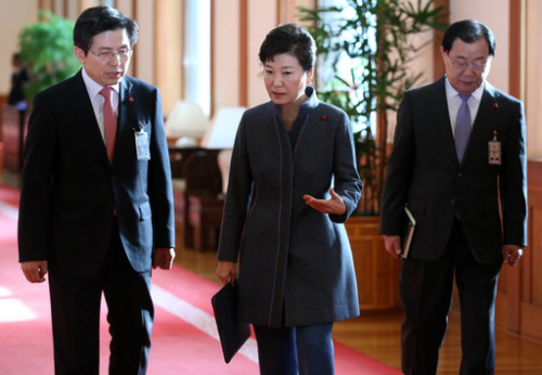 | 박근혜 대통령이 5일 오전 청와대에서 올해 첫 국무회의를 주재했다. 박 대통령이 회의장으로 향하며 황교안 국무총리와 이야기를 나누고 있다. 오른쪽은 이병기 비서실장. 청와대사진기자단 |