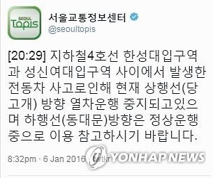 | 서울 지하철 4호선 `퇴근길 중단` 6일 오후 서울 지하철 4호선 한성대입구역과 성신여대입구역 사이에서 전동차 사고가 나 당고개 방향 열차운행이 중단됐다. 이 탓에 퇴근길 시민들이 큰 불편을 겪었다. 사진은 서울교통정보센터가 사고 소식을 알리기 위해 발행한 트윗. 2016.1.6 <<서울교통정보센터 트위터 캡처>> |