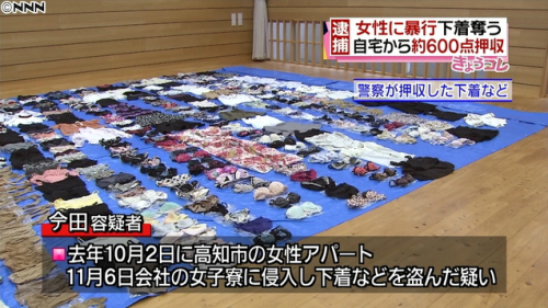 남성은 작년 11월 4일 산책하던 여성의 목을 조르고 입고 있던 속옷을 빼앗아 달아났다. 또 10월 2일 고치시에 있는 아파트에 침입해 여성을 위협하며 속옷을 빼앗았고, 11월 6일에는 여자 기숙사에 몰래 들어가 속옷을 훔쳐 달아났다.