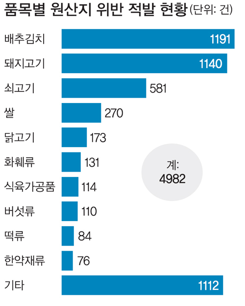 농관원은 지난해 적발한 원산지 위반 행위 2656건을 검찰에 송치했다. 이 가운데 1800건이 징역(33건)이나 벌금(1563건) 등 형사 처벌을 받았다.