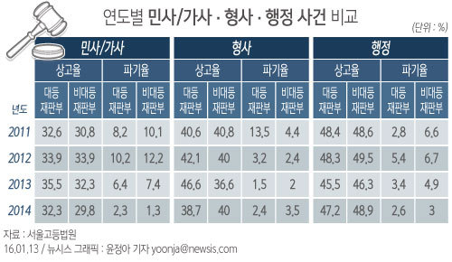 우선 민사·가사 사건의 경우 대등재판부의 상고율(항소심에 불복해 대법원에 상고한 비율)이 비대등재판부와 같았던 2012년을 제외하면 대부분 1.2%~2.7% 정도 높았다.