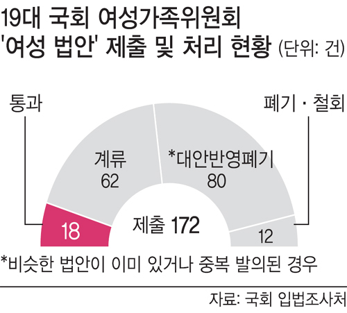 14일 국회 입법조사처 보건복지여성팀 조주은 입법조사관이 쓴 ‘19대 국회 여성분야 입법 현황과 과제’ 보고서에 따르면 19대 국회의 여성법안 처리 성적표는 초라하기 그지 없다.
