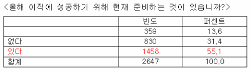 취업포탈 잡코리아가 국내외 기업 직장인 2647명을 대상으로 '올해 이직계획'에 대해 조사를 했다. 그 결과 '올해 이직하기 위해 현재 준비하는 것이 있다'고 답한 직장인은 55.1%에 달하는 것으로 밝혀졌다.