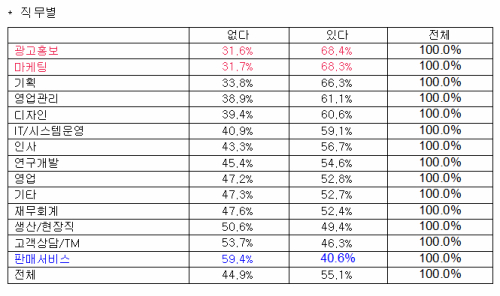 직무별로는 ‘광고홍보’(68.4%)와 ‘마케팅’(68.3%) 직장인들 중에 가장 높았고, ‘판매서비스’(40.6%) ‘고객상담/TM'(46.3%) 직무 분야 직장인들이 상대적으로 낮았다.