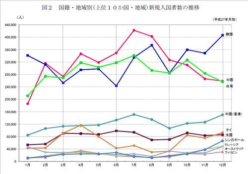 19일 법무성이 홈페이지를 통해 발표한 2015년 외국인 입국 및 일본인 출국자수 자료에 따르면 지난해 외국인 입국자는 총 1천969만명으로 전년에 비해 554만명 늘며 사상 최대를 기록했다.