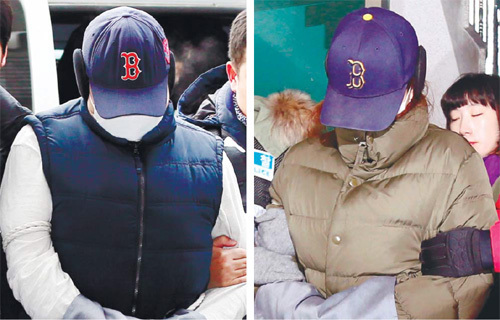 | 초등생 아들을 때려 숨지게 한 뒤 시신을 훼손한 혐의를 받고 있는 최경원씨(왼쪽)와 그의 아내 한씨가 21일 모자와 마스크로 얼굴을 가린 채 현장검증에 나서고 있다. 부천=연합뉴스 |