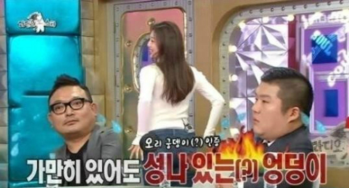 이날 이엘은  자신있는 부위로 엉덩이라고 밝히며  "난 선천적인 오리 궁둥이"라고 말했다. 이어 그는  자리에서 벌떡 일어나 뒤태를 공개했다.