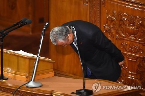 | (AFP=연합뉴스) 아마리 아키라 경제재생담당상이 22일 중의원 본회의에서 경제 연설에 앞서 고개를 숙여 인사하고 있다. |