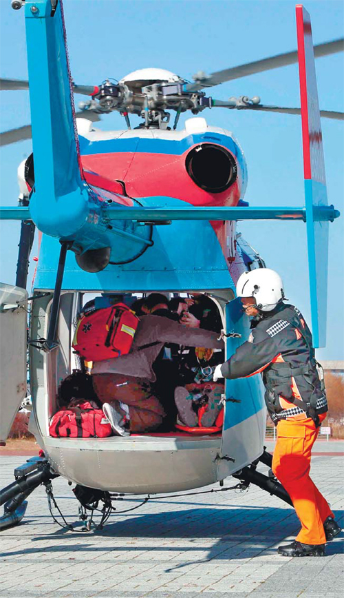 119소방헬기, 응급환자 이송 훈련 입력 : 2016-01-25 18:22:53 수정 : 2016-01-25 18:22:53 구글 네이버 유튜브 25일 부산 사상구 삼락공원에서 부산소방안전본부 특수구조단의 한 대원이 소방헬기를 이용한 중증 외상환자 이송 훈련을 하고 있다. 이번 훈련은 신속한 응급조치로 환자 소생률을 높이기 위해 부산소방안전본부와 부산대병원이 합동으로 진행했다. <연합>연합> Copyright ⓒ 세계일보. 무단 전재 및 재배포 금지 연합