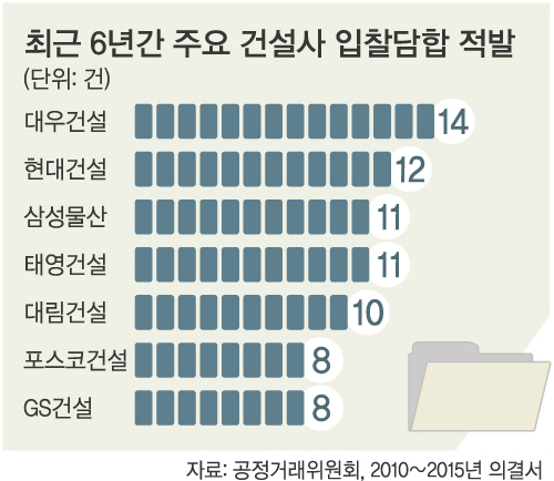 공정위가 민병두 더불어민주당 의원에게 제출한 자료에 따르면 2012년부터 올해 상반기까지 총 6개 건설업체가 무려 30회에 걸쳐 담합해 총 6조2588억원의 매출을 올렸다. 이 기간 6개사가 공정위로부터 담합으로 부과받은 과징금만 2814억원에 달한다.