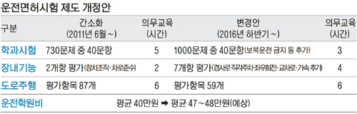 운전전문학원의 전체 의무교육 시간은 13시간으로 동일하지만, 장내기능 교육시간이 2시간 늘면서 평균 40만원선인 학원비도 47만∼48만원으로 늘 전망이다.
