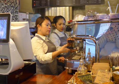 | 결혼이민여성들을 채용하는 사회적 협동조합 ‘카페오아시아’ 서교점에서 바리스타 제나린 루나씨(왼쪽)가 동료와 함께 커피를 내리고 있다. |