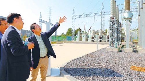 | 구자열 LS그룹 회장(왼쪽)이 LS산전의 제주HVDC스마트센터에 방문해 관계자의 설명을 듣고 있다. LS그룹 제공 |