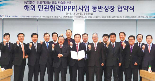 | 이상무 한국농어촌공사 사장(가운데)이 지난해 12월 28일 전남 나주시 본사에서 에너지, 농기계 등 농업 관련 분야 10개의 민간기업과 공동으로 ‘해외 민관공동협력사업 동반성장 협약식’을 체결한 뒤 합의문을 들고 기념촬영을 하고 있다. 한국농어촌공사 제공 |