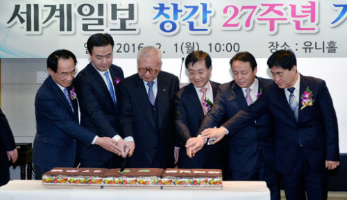 1일 서울시 종로구 세계일보 사옥에서 열린 창간27주년 기념식에서 최윤기 통일재단 이사장, 박인섭 세계평화통일가정연합 세계선교본부 부회장, 김민하 회장, 차준영 사장, 이현영 세계평화통일가정연합 한국부회장, 황학수 세계일보 조사위원 서울시상임위원회 회장(왼쪽부터) 등 내빈들이 축하 떡을 자르고 있다. 차 사장은 기념사에서 “세계일보는 우리사회의 경각심을 불러일으키고 정책변화를 일궈내는 많은 특종을 했으며, 탐사보도에 강하다는 전통을 세웠다”며 “생존경쟁의 벼랑끝에 내몰리고 있는 미디어 현실에 굴하지 않고 종이신문은 물론, 온라인에서도 두각을 나타내는 신문으로 성장하기 위해 더욱 노력하겠다”고 말했다.