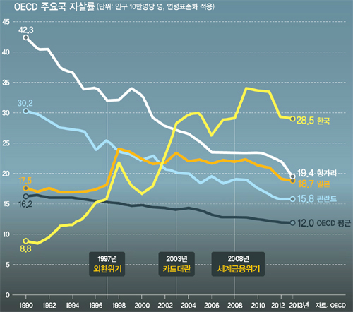 핀란드는 산업화와 도시화가 가속화된 1965∼90년 자살률이 3배나 폭증했다. 1990년 인구 10만명당 자살률은 30.2명이나 됐다. 핀란드 정부는 자살의 확산이 생산가능인구를 감소시켜 국가 경쟁력을 위협하는 요인이라고 판단하고 범정부차원의 대책을 수립했다.