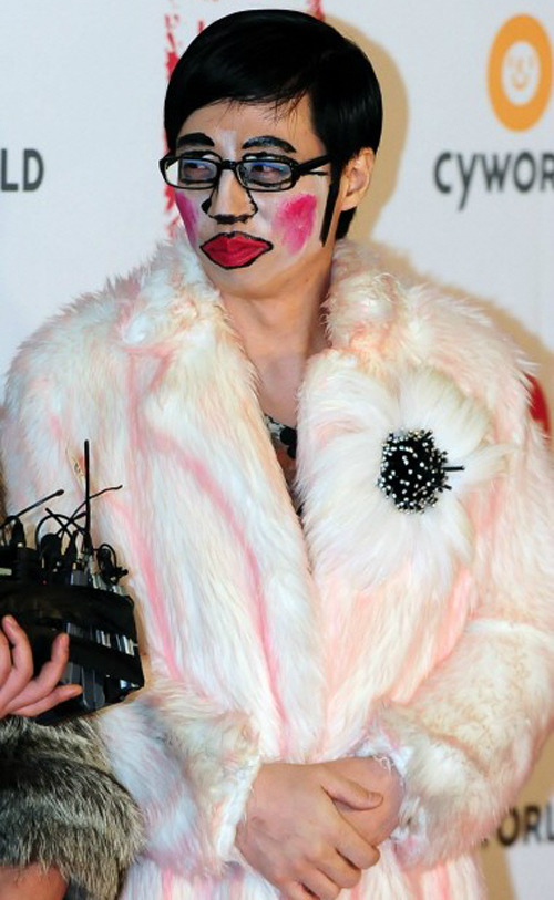 유재석은 런닝맨 진행자로 활약하면서도 다른 방송에서도 매번 최선을 다하는 모습을 보였다 . 이 분장 사진 역시 타방송에서 벌칙으로 수행한 것 .