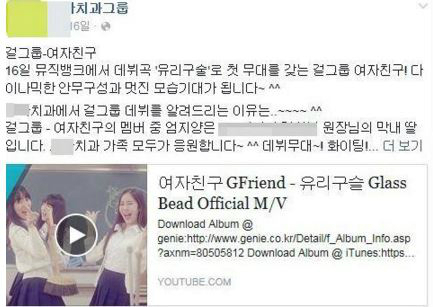 이와 함께 "걸그룹 데뷔를 알려드리는 이유는 멤버 중 엄지 양이 원장님의 막내 딸입니다"라고 설명했다. 이후 여자친구 멤버들의 사인 메시지를 게재하기도 했다.